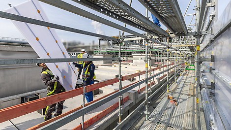 Durch die Montage aus einer gesicherten Position lässt sich PERI UP Cladding schnell und sicher direkt am bestehenden Gerüst errichten. Das System sorgt für erhöhte Sicherheit, da die Montage innerhalb des Gerüstes und das Öffnen einzelner Paneele nach Innen erfolgt.