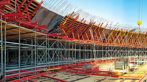 Ab dem zweiten Abschnitt wurden die Schalungssysteme um Bauteile des PERI UP Gerüstbaukastens ergänzt. Da unsere Schalungen und Gerüste nahtlos miteinander kombiniert werden können, war es für unsere Ingenieure umso einfacher, auf effiziente Weise ein Schalungskonzept zu entwickeln. Die Symmetrie des Bauwerks machte die Planung noch effizienter, da sie das Konzept für die gesamte Runde nutzen konnten. „Durch dieses Vorgehen haben wir außerdem Baukosten und Planungszeit stark reduzieren können“, erzählt David.