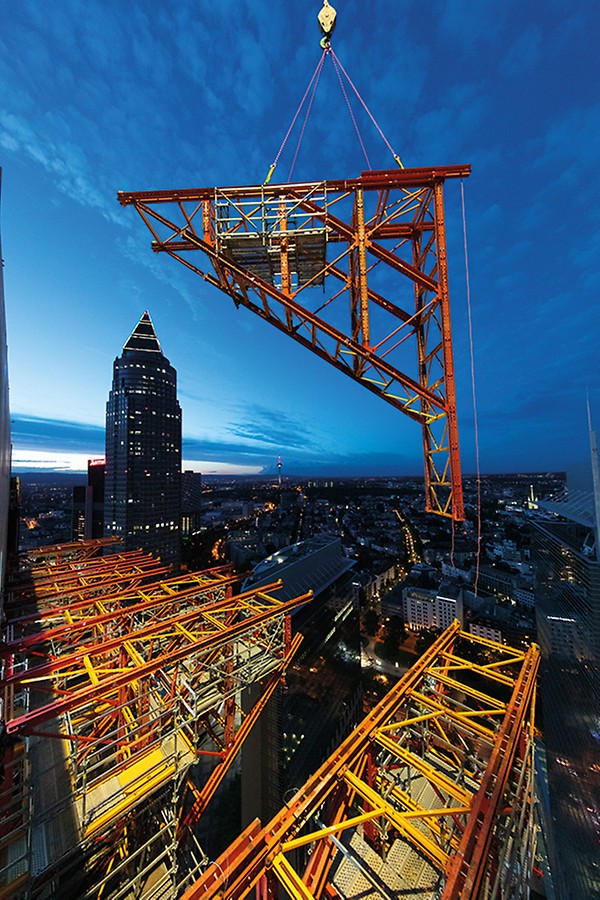 To construct the triangular cantilever on the 33rd floor, the engineers from PERI developed a special construction: 14 console brackets were produced using RCS Climbing Rails as a basis. Within the support brackets, the bracing was carried out using VST Horizontal Ledgers and VST Diagonals. The nodes were joined together with the aid of special connectors. Due to the confined spatial conditions at the inner-city construction site, each of the console brackets had to be pre-assembled in seven transport units at the PERI warehouse in Bürstadt and the PERI formwork assembly facilities in Weissenhorn.