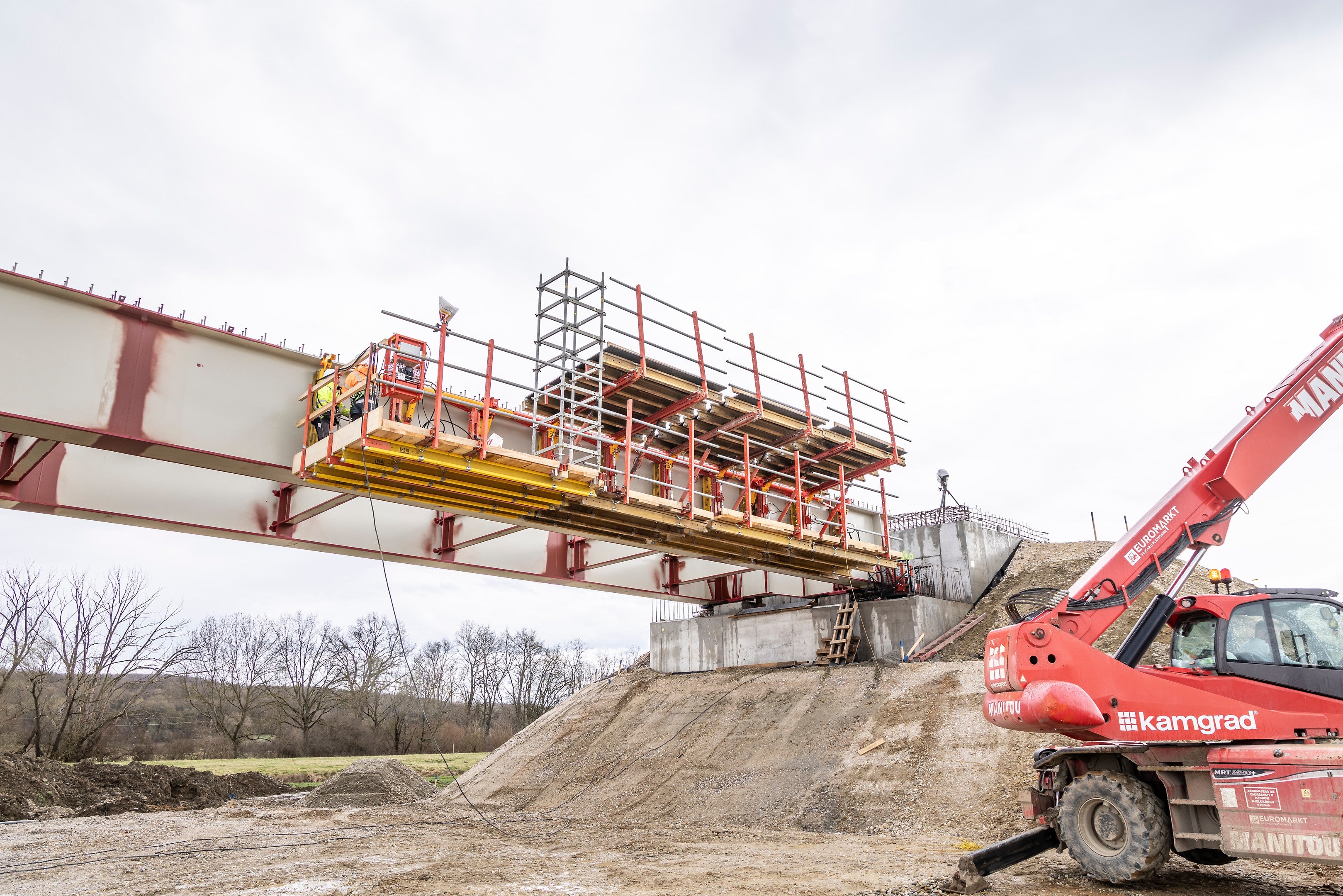 In the construction of steel composite bridges, formwork carriages are traditionally used that run atop the steel structure to cast the carriageway slab using in-situ concrete. However, this method comes with several drawbacks. Since the formwork carriages operate on top of the steel structure, welded brackets are required to support and guide their movement. These remain in the concrete and reduce the quality and service life of the carriageway slab. In addition, a formwork carriage travelling on top is also an obstacle during reinforcement work; even during concreting, such a carriage is disruptive. This is precisely where the VCT Composite Track demonstrates its strengths and why AHA was convinced that the PERI innovation offered the right solution for the second stage of the project.
